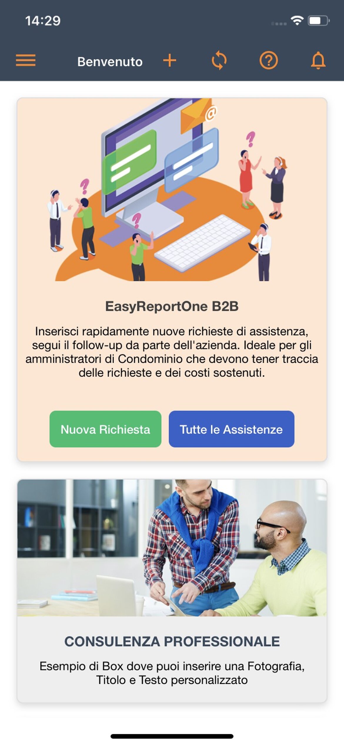 Applicativo Android e iOS con area dedicata ai Clienti B2B che gestiscono molte Richieste di Assistenza provenienti da Condomini, Aziende con filiali e che hanno bisogno di monitorare l'andamento delle Richieste nella propria Area dedicata. Completamente Personalizzabile con il tuo Logo, Immagini e Grafica aziendale.